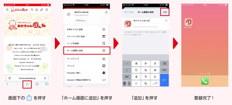 ホーム画面に登録することで、簡単にあかちゃんほんねにアクセスできるようになります!