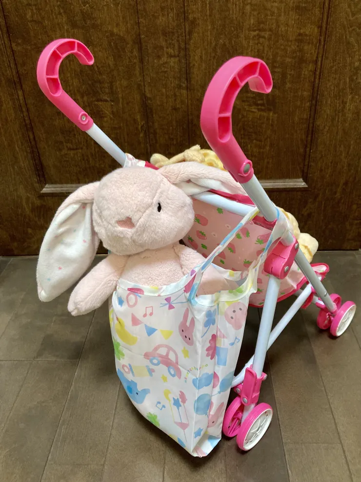 帰宅後しばらく腕にかけたり、中におままごとの野菜を入れて楽しんでいましたが、最終的にはベビーカーにかけられていました笑