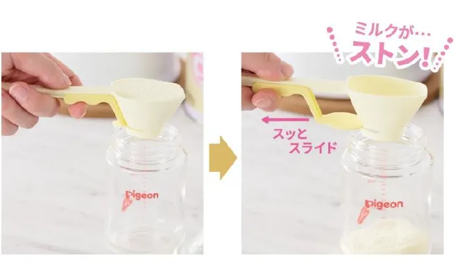 スプーンの底がスライドして開くので、スプーンをひっくり返す必要がなく、粉ミルクをこぼさずにほ乳びんに入れることができる、粉ミルク計量スプーンです。