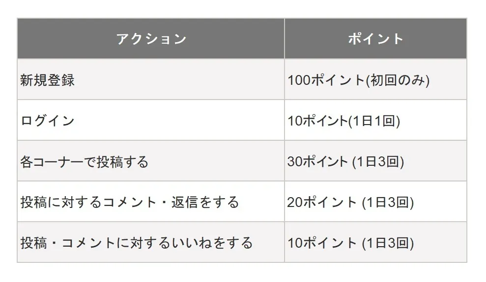 ポイントの獲得方法と獲得できるポイント数は、以下の通りです。アクションに応じてポイントがたまります。